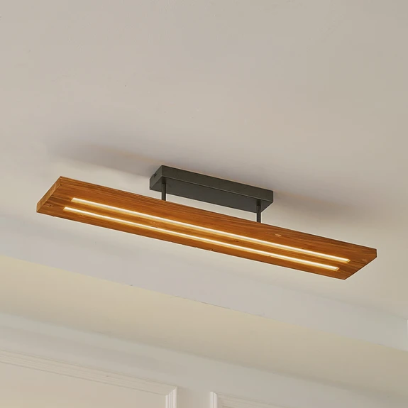 Plafonnier LED Nesaja en bois véritable, à intensité variable sur trois niveaux via un interrupteur mural Nesaja s'adapte bien à tous les intérieurs à l'expression moderne mais naturelle, car l'élément lumineux en forme de planche est en bois véritable avec une surface très naturelle, de sorte que rien ne se perd du charme de ce matériau populaire qui a toujours eu sa place méritée dans le domaine de l'aménagement. Sur la face inférieure de l'élément en bois est encastrée une bande lumineuse composée de LED qui se distinguent par une couleur de lumière chaude et une bonne efficacité. Grâce à un interrupteur mural, il est possible d'allumer et d'éteindre le luminaire comme d'habitude. Grâce à la technique de variateur à 3 niveaux avec fonction Off intégrée, il est en outre possible de faire varier l'intensité de l'éclairage sur trois niveaux différents en actionnant plusieurs fois l'interrupteur : 100 %, 50 % et 10 %.