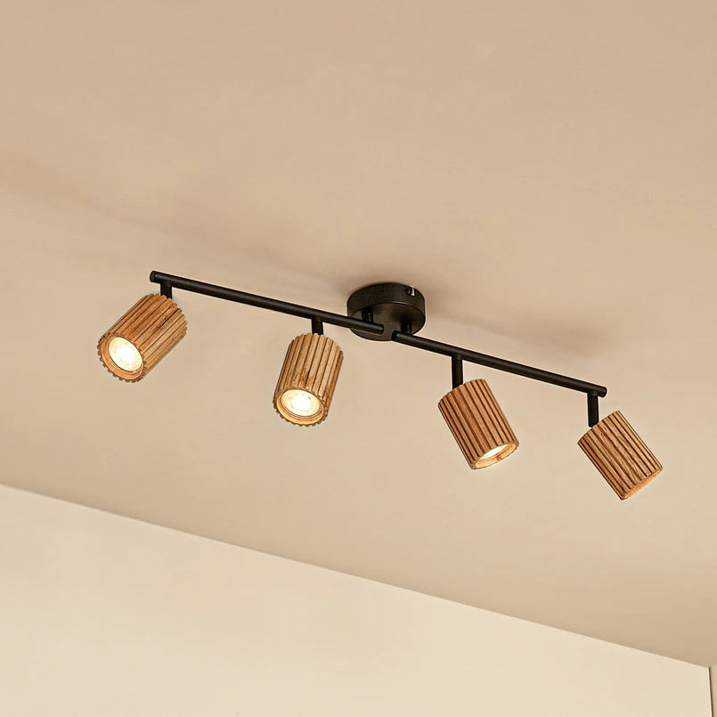 Le spot pour plafond Stralino allie un design moderne à une polyvalence fonctionnelle. Fabriqué en bois de caoutchouc de haute qualité et en fer robuste, ce spot à 4 lampes s'intègre parfaitement dans les concepts d'habitat contemporains. La combinaison d'éléments couleur bois et noirs confère au spot une esthétique attrayante qui met en valeur aussi bien les couloirs que les salons. Une autre caractéristique de ce spot pour plafond est ses spots mobiles qui permettent d'orienter la lumière individuellement.
