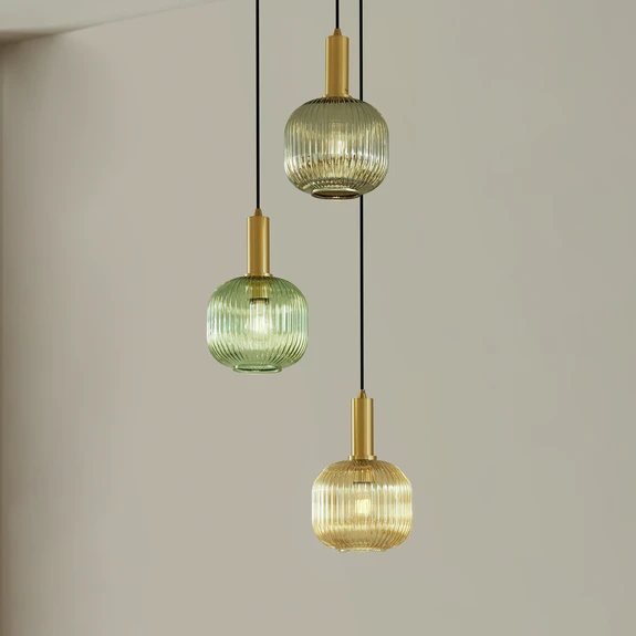 Le charme vintage rencontre les accents de couleur : suspension en vert/ambre/gris fumé