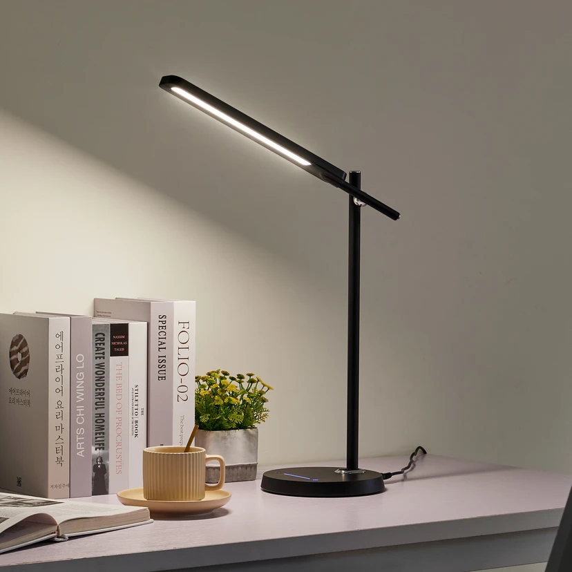 Lampe de bureau LED noire Valtorin - une compagne moderne pour le bureau avec fonction dimmable et CCT La lampe de bureau LED Valtorin séduit par son design fin et minimaliste. Elle est de couleur noire et se compose de deux entretoises. Ses LED fixes génèrent une couleur de lumière blanc uni et peuvent être réglées en continu. C'est pourquoi Valtorin peut fournir l'éclairage adéquat à tout moment. Son design sobre s'intègre facilement dans le style d'aménagement des bureaux ou des salles de travail.