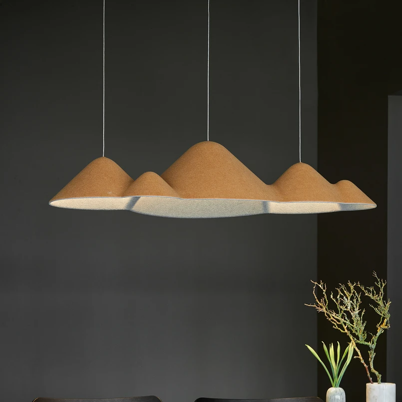 Suspension LED Panorama en feutre - conçue dans les contours d'un paysage La suspension Panorama est un diffuseur de lumière à la fois exceptionnel et confortable. Une surface en feutre orne le rosace et l'abat-jour. Ce dernier prend la forme d'un paysage de montagne stylisé. Le module LED intégré diffuse une lumière blanche chaude avec un bon rendu des couleurs (CRI 90) vers le bas. Variation d'intensité variable externe TRIAC.