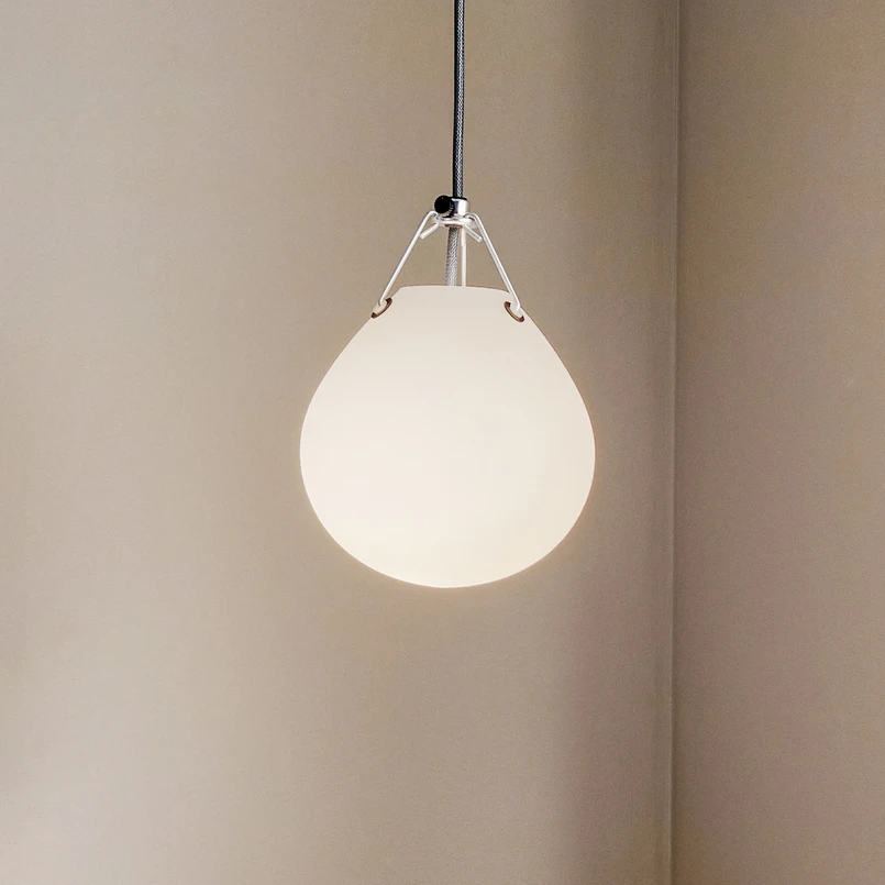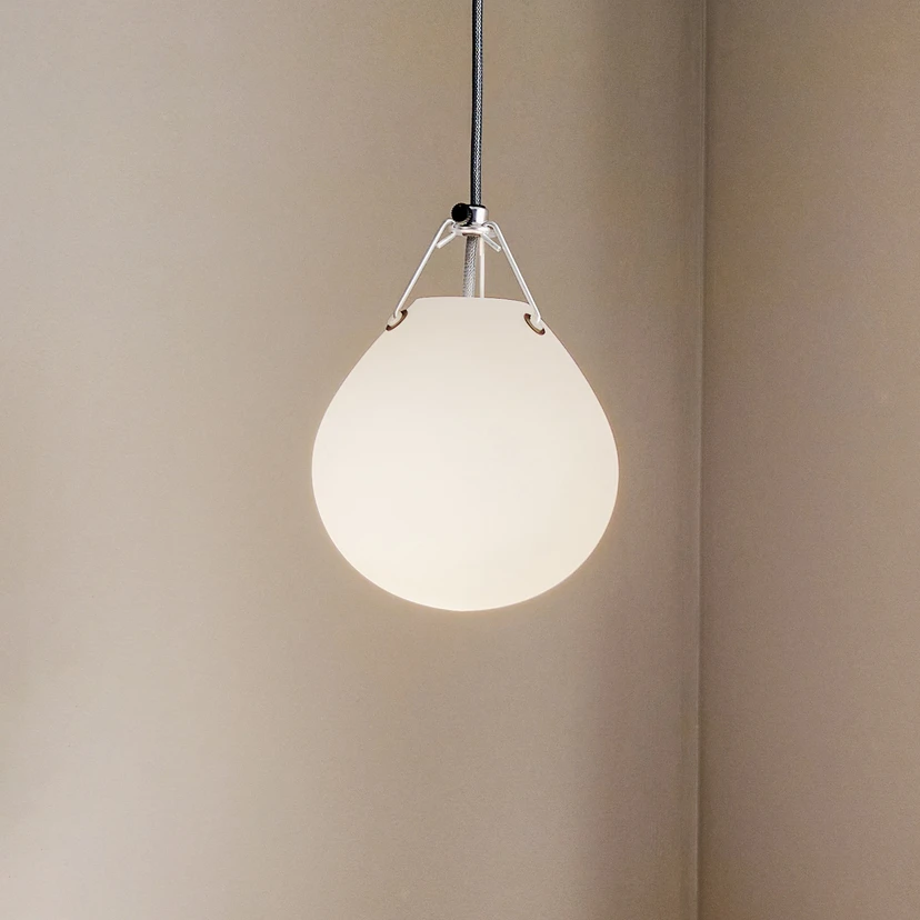 Le verre opale a été soufflé à la bouche, la suspension est en aluminium poli. L'abat-jour en verre traité de haute qualité rayonne la lumière de l'illuminant inséré de manière homogène et sans éblouissement tout autour. La lampe à suspension Moser est une source de lumière qui se distingue par sa beauté simple et peut être combinée avec une grande variété de meubles.
