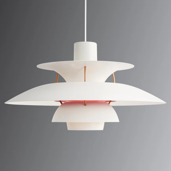 Le triple abat-jour dont est équipée la suspension est issu des dessins de Poul Henningsen, le célèbre designer danois qui a créé des produits pour la société Louis Poulsen de 1925 à sa disparition en 1967. Louis Poulsen est une entreprise danoise traditionnelle en ce qui concerne la fabrication de lampes de designer, développées fidèlement au principe "la forme suit la fonction". Depuis plus de 100 ans, Louis Poulsen produit des solutions d'éclairage typiquement scandinaves, certains modèles sont disponibles depuis des décennies et sont régulièrement réédités. 2018 marque le 60e anniversaire de la naissance de la PH 5. À cette occasion, de nouvelles combinaisons de couleurs de ce luminaire classique ont été lancées sur le marché.