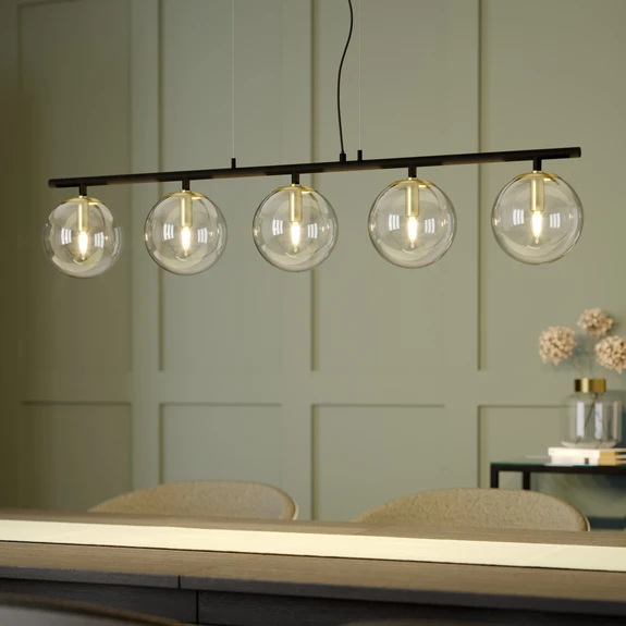 Suspension linéaire Sotiana allongée avec cinq abat-jour sphériques en verre
