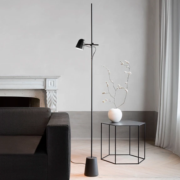 Le lampadaire LED au design puriste Counterbalance bénéficie d'un mécanisme coulissant spécial qui permet de régler en continu la hauteur de la tête du luminaire en aluminium en forme de capot sur toute la longueur de la tige. La tête comporte une autre particularité, à savoir un variateur qui permet de régler la lumière en trois niveaux : 0 pour cent, 50 pour cent, 100 pour cent.