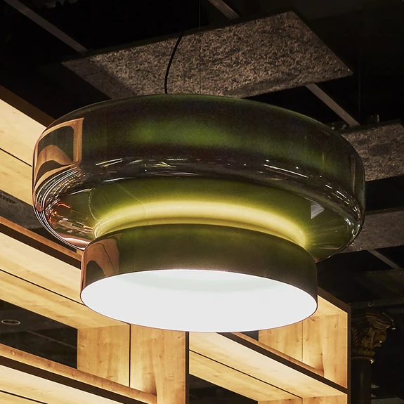 Les deux formes assemblées créent un sentiment d'imperfection qui confère à la lampe suspendue son caractère. Au milieu, elle se termine de manière étroite et donne l'impression d'être attachée ensemble. Sur ce bord se forme un anneau lumineux à travers lequel la lumière s'échappe vers l'extérieur et reçoit une direction de lumière consciente par le haut et par le bas en se déplaçant vers l'intérieur. L'intérieur de l'abat-jour est blanc, ce qui donne une lumière homogène et agréable qui, grâce à l'ouverture à l'extrémité inférieure, permet une diffusion directe de la lumière et un éclairage complet des tables.
