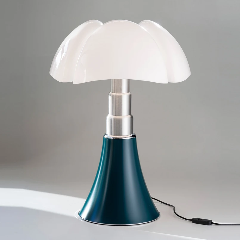 Grande lampe de table Pipistrello Med au design intemporel avec quatre ampoules LED E14 Cette lampe à poser fabriquée par Martinelli Luce est imposante compte tenu de sa hauteur et de son pied métallique d'apparence solide. Conçue dès 1965 par l'architecte et designer italienne Gaetana "Gae" Aulenti (1927 - 2012), Pipistrello s'intègre aussi bien dans un intérieur inspiré du style de l'époque que dans une ambiance moderne, posée sur une table ou au sol. Les caractéristiques de la lampe de table Pipistrello sont, d'une part, son abat-jour en méthacrylate opale divisé en quatre sections, qui diffuse la lumière des quatre ampoules LED E14 de manière homogène dans la pièce, et d'autre part, son pied concave. Ce dernier se compose d'une section inférieure en aluminium laqué et d'un élément supérieur télescopique en acier inoxydable qui permet d'ajuster la hauteur - hauteur réglable de 66 à 86 cm - interrupteur marche/arrêt sur le câble de la prise