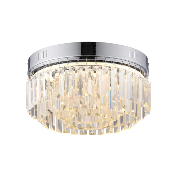 Dimmable en continu via un interrupteur mural traditionnel : plafonnier LED avec suspension en cristal, 3 000 K L'élégant plafonnier LED Krista se distingue par sa suspension en verre cristal. Celui-ci est suspendu à la suspension circulaire et chromée. Des LED d'un blanc chaud sont intégrées d'origine. La fonction SimplyDim est un point fort particulier. Grâce à elle, l'intensité peut être variée en continu via l'interrupteur mural traditionnel.