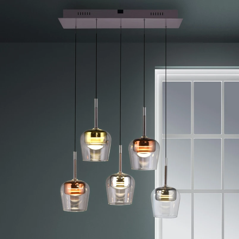 Suspension LED Q-Kon à 5 lampes avec abat-jour en verre et détails métalliques - intelligente et pilotable par télécommande La suspension LED Q-Kon enrichit, tant par son aspect extérieur que par sa fonctionnalité, les espaces de vie et de détente aménagés de manière moderne. Les cinq abat-jour placés sous un rosace rectangulaire sont chacun équipés d'un verre transparent bombé qui se termine en bas. À l'intérieur se trouve à chaque fois un corps en aluminium - un en finition or, deux en finition bronze et argent. Les modules LED qui rayonnent vers le bas assurent un éclairage direct de la table ou de la zone. Grâce au Comfort Lift, il est possible d'ajuster manuellement la hauteur de la suspension à tout moment. Une télécommande Q appropriée est fournie pour la commutation, le variateur d'intensité et le réglage de la température de couleur. Celle-ci offre non seulement un réglage libre de la lumière, mais aussi des options préconfigurées, de sorte que l'éclairage parfait est facilement disponible pour presque toutes les situations. En alternative, la suspension Q-Kon peut être intégrée par radio dans les systèmes Smart Home basés sur ZigBee (pont nécessaire), afin de procéder à une commande par application ou par commande vocale, selon la configuration.