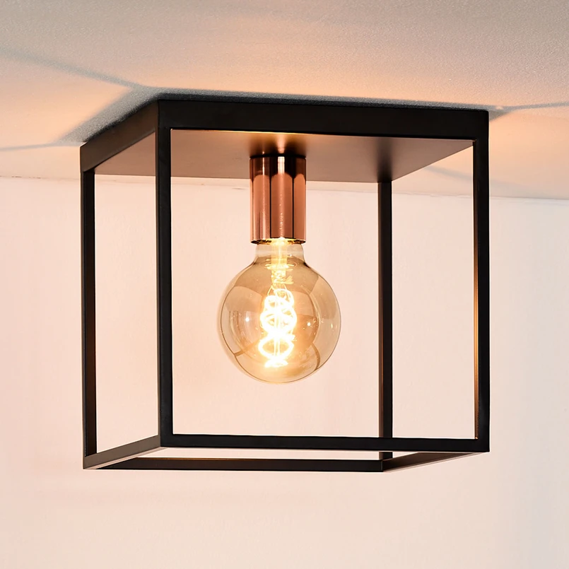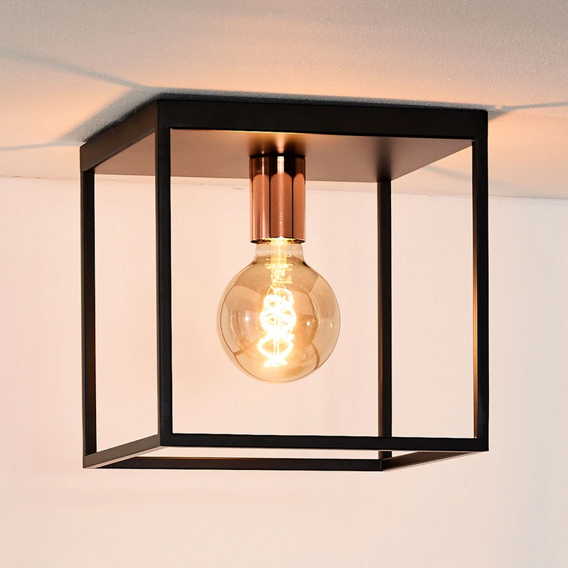 Le plafonnier métallique Arthur est conçu en forme de cube dont les bords sont définis par des entretoises noires. Seul le côté adjacent au plafond forme une surface continue. La douille de la lampe est placée au centre de cette surface, qui attire l'attention par sa forme cylindrique et sa coloration en cuivre brillant. La conception ouverte permet de voir la lampe, de sorte qu'une lampe en optique à filament se montre sous son meilleur jour et fait du plafonnier Arthur un choix élégant pour l'espace de vie au design moderne.