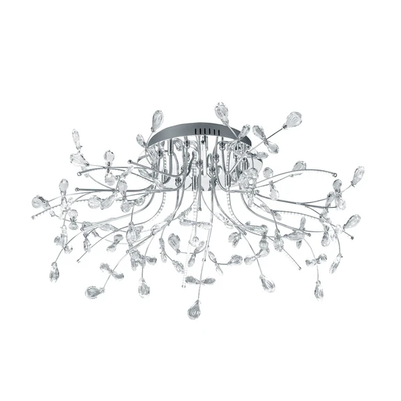 Plafonnier LED Crystal au design dynamiqueLe design du plafonnier LED Crystal est à la fois plein d'élan et ludique. Il séduit non seulement par son apparence, mais aussi par son effet lumineux : de nombreux cristaux de verre s'enroulent autour du baldaquin rond à l'aide de bras métalliques étroits et rejoignent les bandes métalliques courbées avec autant d'élan, qui sont équipées de LED blanc chaud. Les réflexions lumineuses des différentes facettes de verre et de la surface chromée produisent une lueur efficace et uniforme qui met en scène non seulement le luminaire, mais aussi tout l'environnement. Caractéristiques techniques:- version Ø 54 cm = non dimmable- version Ø 77 cm = dimmable par variateur à coupure de phase (non compris)