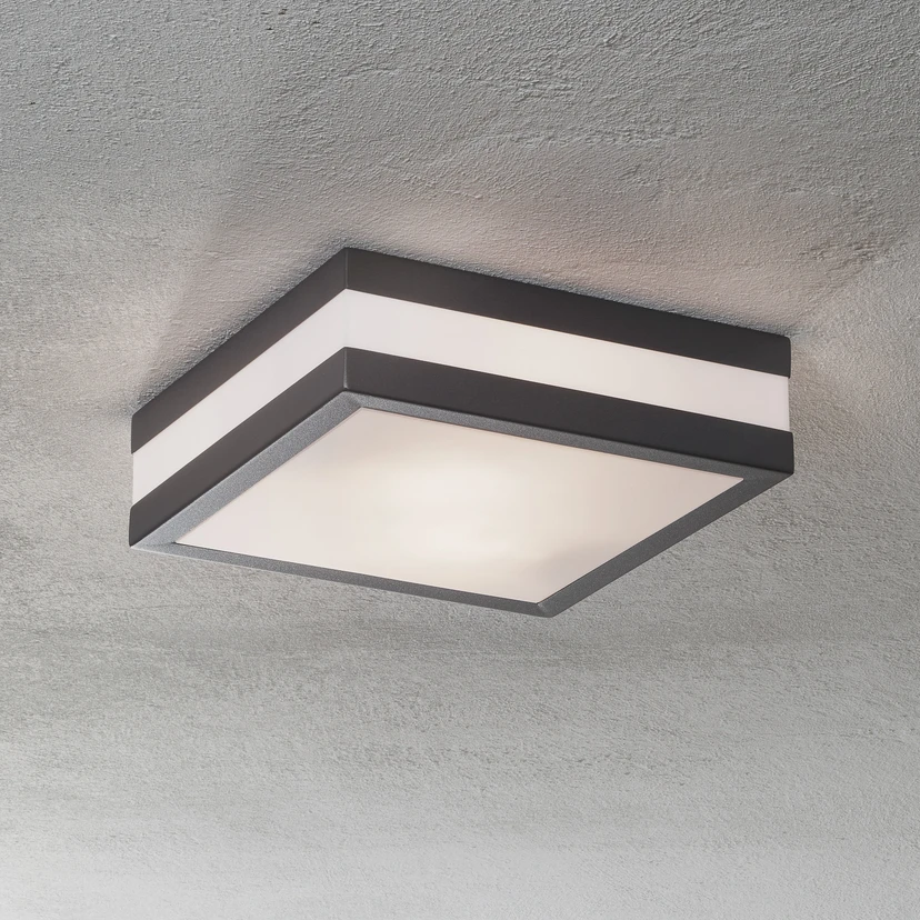 Plafonnier d'extérieur blanc-anthracite Matteo, IP44 Le plafonnier d'extérieur Matteo est conçu pour être monté au plafond. Il est protégé contre les projections d'eau par un indice IP44, ce qui permet de l'utiliser sans problème à l'extérieur. Son cadre englobe le diffuseur en plastique blanc et est fabriqué en acier inoxydable de couleur anthracite - le plafonnier a ainsi un aspect élégant et de grande qualité et assure en outre une lumière non éblouissante. Le cadre crée un motif lumineux discret qui se reflète dans l'environnement et crée une ambiance agréable. Matteo permet d'éclairer idéalement les abris de voitures, les garages, les auvents, les façades ou encore les terrasses et les balcons. Sur demande, Matteo peut également être fixé au mur. Le luminaire est équipé de deux ampoules E27, qui peuvent être achetées dans les accessoires.