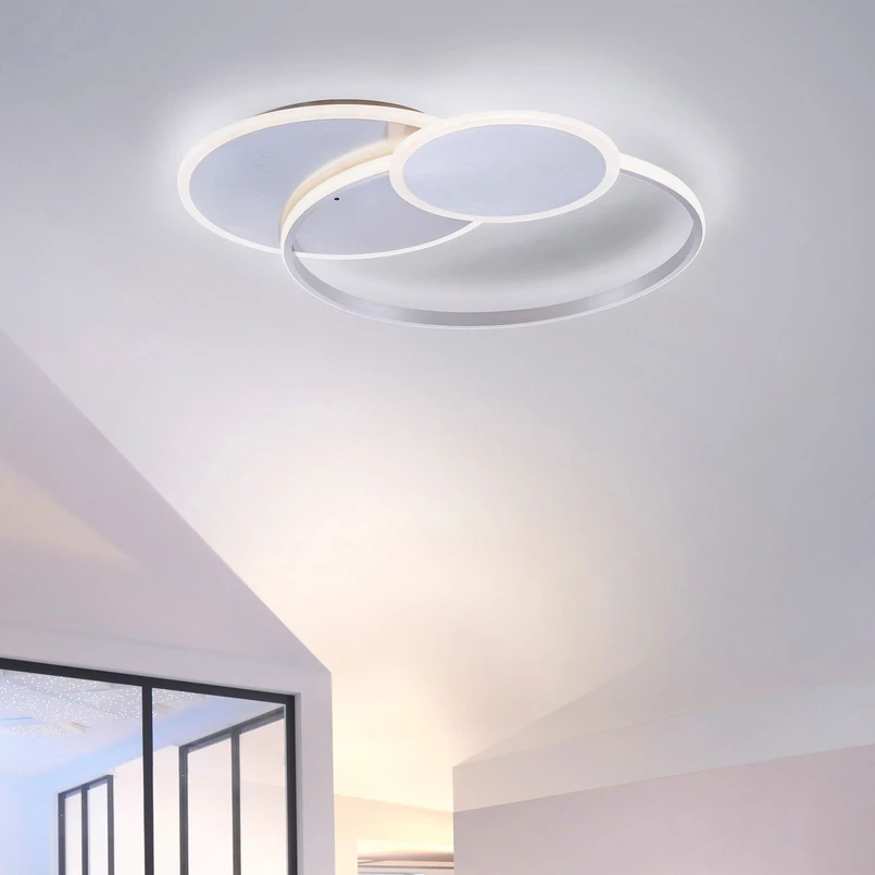 Le plafonnier LED rond inspire non seulement par son design plat, mais aussi par sa modernité, qui fait briller la maison à travers les trois anneaux de lumière. Emilio est fourni avec une télécommande à infrarouge permettant de régler individuellement la couleur de la lumière du blanc chaud (2 700 K) au blanc universel (5 000 K). Le contrôle variable de l'intensité lumineuse peut également être facilement adapté à ses propres besoins en diminuant l'intensité. La fonction mémoire permet de mémoriser facilement le réglage souhaité.