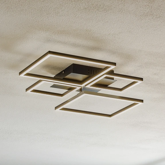 Le plafonnier LED moderne Frame se compose de quatre éléments métalliques carrés - deux grands cadres ouverts et deux plus petits. Leurs faces inférieures sont dotées de caches en plastique satiné à travers lesquels la lumière des LED intégrées est diffusée et diffusée vers le bas.