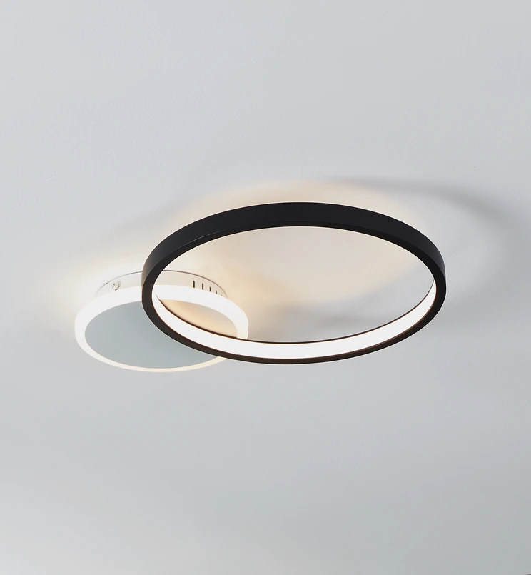Plafonnier LED Gafares : commande d'éclairage polyvalente avec télécommande pour les espaces de vie modernes Le plafonnier LED Gafares allie design moderne et polyvalence fonctionnelle. Fabriqué en aluminium, en acier et en plastique, il s'intègre parfaitement dans différents espaces de vie comme le salon, le couloir, la cuisine et la salle à manger. La lampe offre une impressionnante variété de couleurs, du blanc chaud à la lumière du jour, grâce à la fonction CCT intégrée. La source lumineuse LED fixe assure un éclairage uniforme et une grande fidélité des couleurs de 80 Ra, ce qui crée une atmosphère agréable. Une caractéristique particulière du Gafares est la facilité de contrôle de l'intensité lumineuse grâce au variateur d'intensité variable inclus. Cela permet d'adapter la luminosité de manière flexible afin de créer l'ambiance souhaitée. La télécommande offre un confort supplémentaire en permettant de contrôler aisément les conditions d'éclairage. La combinaison d'une lumière à faible consommation d'énergie et d'un coloris noir et blanc élégant fait du plafonnier LED Gafares un choix idéal pour les intérieurs modernes. Contrôle à l'aide de la télécommande fournie : sélection de la lumière blanche chaude, blanche neutre et blanche du jour, variation de l'intensité, veilleuse LED et fonction de minuterie (extinction après 30 minutes).