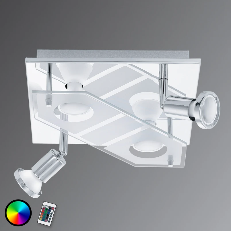 La lampe Cabo-C peut être installée au plafond ou au mur. Mais ce n’est pas tout. Ce luminaire est fourni avec des ampoules LED RGBW GU10, ce qui permet d’obtenir un éclairage dans 16 couleurs différentes ou une agréable lumière blanc chaud pour une ambiance lumineuse plus sobre. La luminosité peut également être réglée à l’aide de la télécommande. Quatre programmes lumineux sont déjà préréglés. Le changement de couleur s’effectue à l’aide de la télécommande. Lampe fournie avec télécommande et ampoules LED RGBW GU10.
