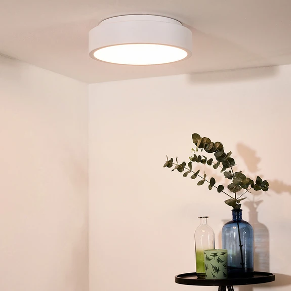 Plafonnier LED rond Talowe en blanc Talowe se compose d'un corps rond en aluminium blanc dont le bord se prolonge verticalement vers le bas. Les sources lumineuses LED ne sont pas placées dans la surface centrale circulaire adjacente au plafond, mais derrière un cache en acrylique mat à l'intérieur du bord. Cela fait de Talowe une source d'éclairage de base qui, avec sa forme simple et intemporelle, s'harmonise avec de nombreux espaces de vie et de séjour aménagés de manière différente. En Bonus, Talowe est compatible avec les variateurs à coupure de phase descendante et ascendante.