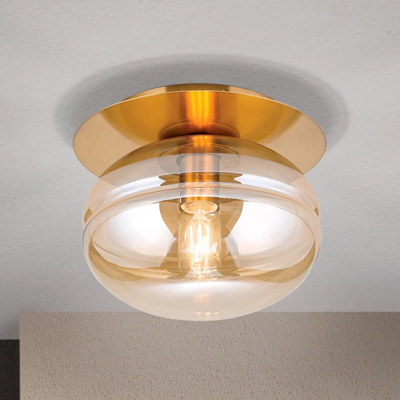 Plafonnier Richard avec abat-jour en verre soufflé à la bouche Le plafonnier Richard, composé d'un rosace en métal et d'un abat-jour en verre soufflé à la bouche fixé sur celui-ci par un filetage, est noble et brillant. La douille E27, qui peut être équipée d'une ampoule LED jusqu'à 8 W, est placée au centre de l'abat-jour de forme bulbeuse, divisé horizontalement par une rainure. Comme l'ampoule est visible à travers l'abat-jour en verre transparent, il est recommandé d'utiliser une ampoule LED à filament claire. Le plafonnier Richard - monté seul ou à plusieurs - éclaire les couloirs et les pièces d'habitation avec une lumière diffusée dans toutes les directions. En choisissant une ampoule à intensité variable, il est également possible de régler l'intensité lumineuse.