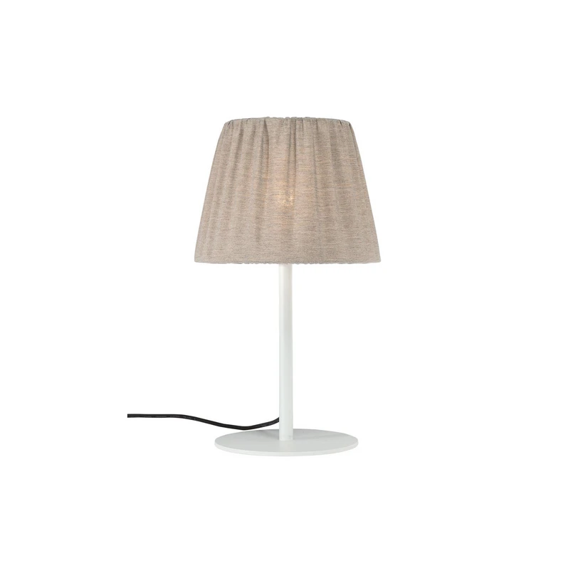 Lampe à poser robuste pour l'extérieur - Agnar de PR Home La lampe à poser Agnar est fabriquée pour l'extérieur. L'abat-jour est composé d'un tissu 100% acrylique Dralon qui peut être utilisé à l'extérieur par tous les temps. Le tissu a un effet mélangé et est certifié Oeko-Tex 100 avec une haute résistance à la lumière (5-7). De plus, un traitement au Téflon résistant à l'eau et aux salissures a été effectué. La structure de la lampe est galvanisée et entièrement blanche. Un couvercle en plastique blanc et un joint d'étanchéité protégeant de l'humidité sont placés au-dessus de l'ampoule et de la douille. L'abat-jour est fixé au socle de la lampe à l'aide d'un support spécial.