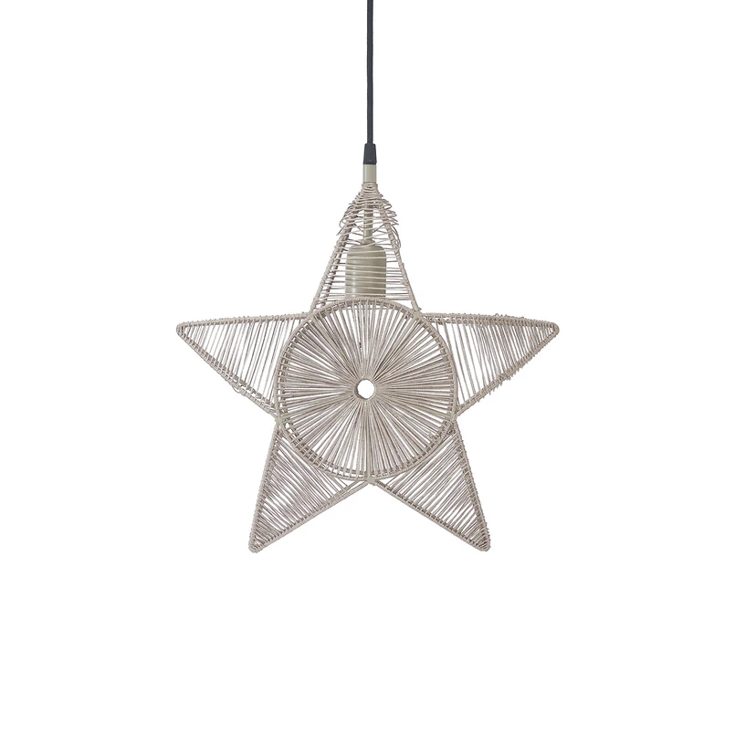 Étoile décorative au design remarquable Regina L'étoile de Noël Regina est fabriquée à partir d'un cadre métallique entouré de fil à la main. Une forme moderne et géométrique qui convient au style scandinave et qui diffuse une belle lumière dans la pièce. Avec ce luminaire, une atmosphère de Noël s'installe dans la maison. À l'aide d'une petite ouverture sur le dessous, on accède à l'intérieur de l'étoile et on peut facilement visser l'ampoule. Le câble textile noir mesure environ 3,5 m de long et est équipé d'une fiche murale européenne et d'une douille E27. L'ampoule n'est pas incluse, les ampoules adaptées peuvent être commandées séparément via les accessoires.