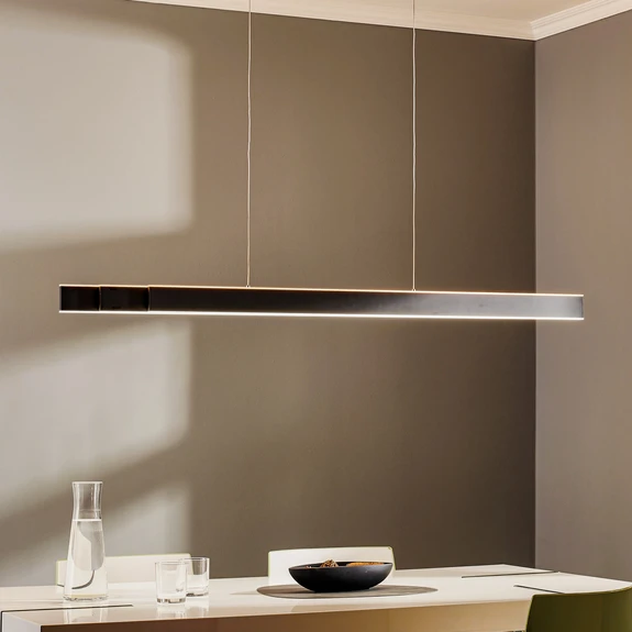 Suspension LED Pure-Lume en aluminium avec fonction CCT et capteurs La suspension LED Pure-Lume, longue et étroite, de forme rectiligne, s'intègre dans de nombreux styles d'aménagement et offre un éclairage très variable, car elle est à la fois réglable en couleur de lumière sur trois niveaux grâce à la technique d'éclairage CCT et graduable en continu. De plus, la longueur du luminaire peut varier, car l'abat-jour, composé de trois éléments étroits, est extensible. La commande de la lumière diffusée vers le haut et vers le bas est assurée par des capteurs intégrés en haut et en bas du luminaire. De brefs mouvements dans la zone des capteurs commandent la couleur de la lumière, un maintien de la main en dessous du capteur démarre le processus de variation, qui s'arrête dès que la main est retirée de la zone des capteurs. La couleur de la lumière peut être réglée dans une plage allant de l'éclairage blanc chaud à l'éclairage blanc neutre et est variable en continu. Cette grande flexibilité dans la conception de l'éclairage fait de la suspension une source de lumière polyvalente, que ce soit au-dessus du comptoir de la cuisine ou de la table à manger - dans chaque zone et pour chaque activité, l'éclairage peut être réglé selon les souhaits.