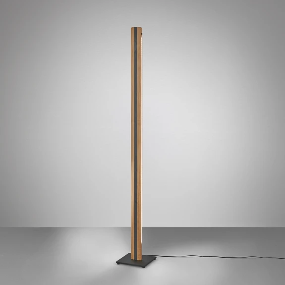Lampadaire LED Elis à intensité variable en bois de chêne et rubans noirs L'élégance et la fonctionnalité se fondent dans le lampadaire LED Elis, un chef-d'œuvre de design moderne qui crée une atmosphère chaleureuse et accueillante dans chaque salon ou salle à manger. La combinaison harmonieuse du bois de chêne et de la finition noire confère à cette lampe sur pied une esthétique intemporelle qui s'intègre parfaitement à tout type d'intérieur. Avec une source lumineuse LED intégrée, Elis offre non seulement une longévité impressionnante, mais aussi une efficacité énergétique élevée qui réduit le besoin de changer fréquemment les ampoules tout en contribuant à la réduction de la consommation d'énergie. La fonction de gradation intégrée permet d'ajuster la luminosité à volonté afin de créer l'ambiance lumineuse parfaite pour chaque moment de la journée et chaque activité. La lumière est alors diffusée aussi bien vers l'avant que vers l'arrière. Grâce à la fonction de mémoire intégrée, le dernier réglage d'éclairage sélectionné est utilisé lorsque le lampadaire est allumé. La surface du lampadaire a été fabriquée à la main avec beaucoup de soin. Elis incarne un investissement dans des solutions d'éclairage durables qui sont à la fois stylées et fonctionnelles. Que ce soit pour un coin lecture confortable ou comme éclairage d'accentuation pour des soirées conviviales, cette lampe sur pied est un accessoire polyvalent qui confère une touche particulière à chaque pièce.
