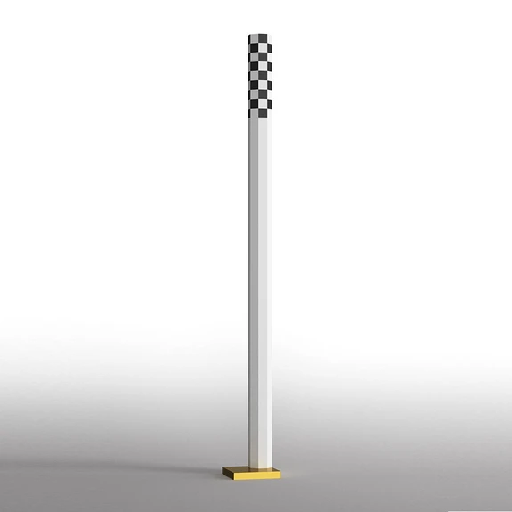 La caractéristique frappante du plafonnier LED Ciminiere d'Italia est la colonne hexagonale qui n'est pas placée au centre, mais dans un coin de la plaque de base dorée. Malgré la forme allongée et l'emplacement asymétrique de la colonne sur la plaque de base, il est remarquable que ce lampadaire ne perde pas sa stabilité, mais qu'il repose sur le sol de manière massive et robuste. Le motif en damier noir et blanc qui orne le quart supérieur du luminaire est tout aussi frappant.