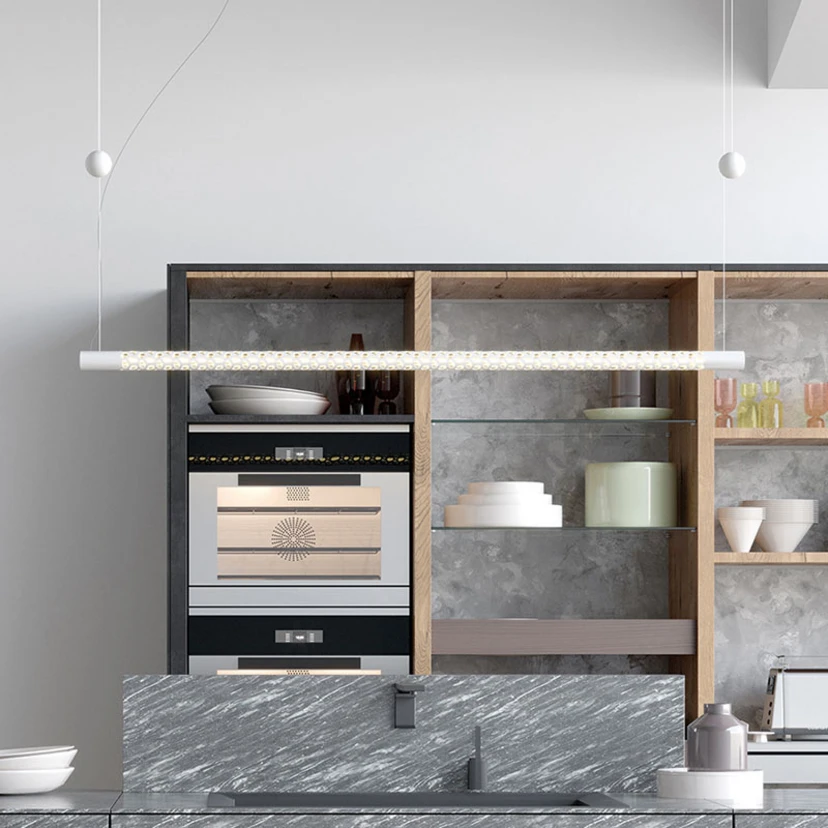 La lampe suspendue Squiggle est suspendue à de gracieuses cordes à peine visibles et semble presque flotter dans la pièce. Un tube étroit forme son abat-jour, qui est entièrement fabriqué en aluminium et contient des LED blanc chaud. Le tube est suspendu horizontalement et couvre une grande surface, qu'il est capable d'éclairer grâce à sa puissance lumineuse spéciale. Tout au long du logement, de nombreux petits hexagones sont perforés dans la teinte et forment un motif individuel attrayant. Grâce à ces ouvertures, la lumière émerge tout autour et crée des effets de lumière atmosphérique.