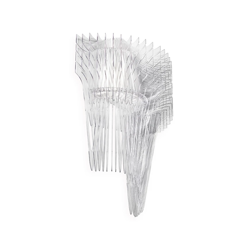 L'applique murale Aria se distingue par sa taille imposante et son architecture d'éclairage dynamique et fluide. Grâce à une structure radiale composée de 50 "bras" différents, les sources lumineuses sont protégées à l'intérieur de la corbeille, tout en créant un volume tridimensionnel. Seuls des technopolymères de haute qualité, comme le Lentiflex® et le Cristalflex®, produits par Slamp, ont été utilisés pour la fabrication de ce luminaire design. Le Lentiflex® permet un éclairage chaud et uniforme, tandis que le Cristalflex® confère aux luminaires Slamp la grâce et la préciosité du verre. Les technopolymères sont des matières plastiques qui se distinguent par leur légèreté mais aussi par leur résistance à la rupture.
