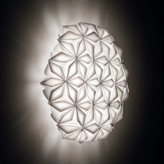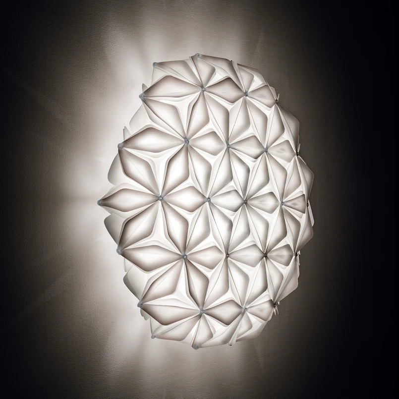 Plafonnier unique La Vie - inspiré par la fleur de la vie Avec un langage symbolique efficace, le plafonnier La Vie est synonyme d'énergie et d'harmonie - le luminaire s'inspire de la fleur de la vie et séduit par ses éléments délicats, pliés à la main. De nombreuses fleurs donnent naissance à un motif captivant qui assure des effets lumineux tout aussi captivants. Le fabricant italien de luminaires Slamp, dont le siège est à Rome, est synonyme de durabilité et d'unicité, ce qu'il a une nouvelle fois prouvé avec cette série de luminaires. Le caractère unique des créations de Slamp est dû à l'utilisation de technopolymères nobles et résistants à la rupture, à partir desquels des matériaux brevetés et innovants ont été développés. Pour La Vie, ce sont Lentiflex® et Opalflex® qui sont utilisés. Deux matériaux très flexibles, résistants et légers, dont les déchets sont recyclés. Grâce aux éléments en verre, l'abat-jour du luminaire est plus transparent et plus brillant, ce qui confère à la lumière un effet particulier. Pour que la lumière, plutôt ponctuelle, puisse être largement diffusée et créer un éclairage global, les différents connecteurs ont été pliés et fabriqués selon un angle d'inclinaison spécial. Grâce au support magnétique et aux connecteurs fabriqués à la main, l'utilisation de vis et de colle est évitée et le remplacement des ampoules (non incluses) et le nettoyage sont facilités. La Vie peut également être installée comme applique murale.