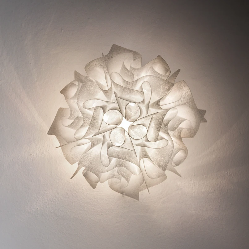Contrairement à son apparence, qui donne l'impression que le luminaire est fabriqué en tissu fin, l'abat-jour de ce plafonnier design unique Veli Couture Medium est en plastique de haute qualité, spécialement développé et breveté par le fabricant Slamp. Ce matériau, appelé Lentiflex®, fait de ce luminaire une source de lumière enchanteresse grâce à son effet lumineux très particulier. Il peut être utilisé au plafond ou au mur et déploie son effet unique aussi bien dans les pièces d'habitation privées que dans les hôtels, les établissements de restauration, etc. Seules des ampoules LED (E27 max. 12 W) peuvent être installées dans les deux douilles derrière l'abat-jour au design grandiose. Pour mettre en valeur l'effet de l'abat-jour travaillé à la main, le fabricant recommande l'utilisation d'ampoules LED à l'aspect filament.