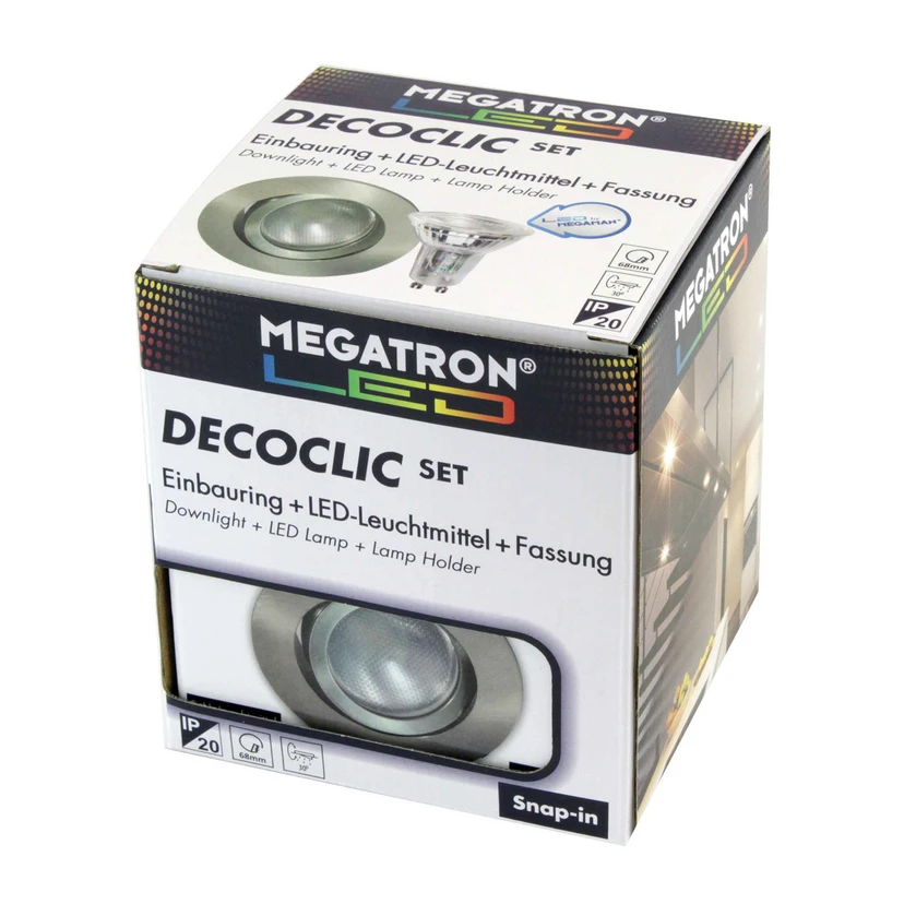 Spot encastrable LED Decoclic avec ampoule LED GU10 en Set Complètement sans outil et très facile à monter, ce spot encastrable LED rond Decoclic se monte par encliquetage avec un SPRENGRING. Le spot encastrable est livré avec une ampoule LED à culot GU10 et convient à l'éclairage à économie d'énergie de toutes les pièces. Le spot encastrable LED Decoclic, fabriqué en aluminium, s'adapte aux découpes de plafond de 6,8 cm de diamètre et peut être incliné de 30°, ce qui permet de varier la direction de la lumière. Il n'est pas à intensité variable.