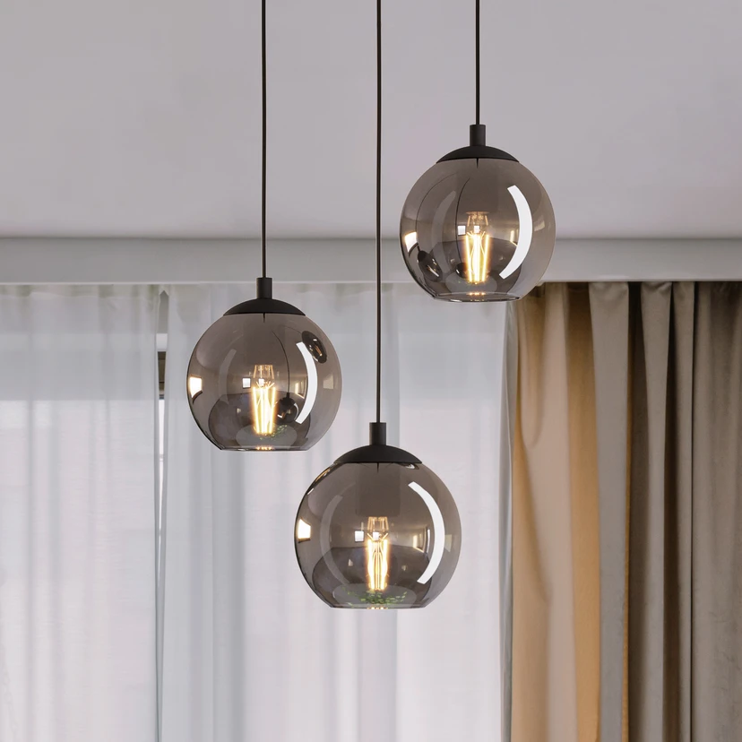 La suspension Ariscani allie un design intemporel à des matériaux haut de gamme. Fabriquée en verre et en acier, elle apporte une touche d'élégance aux salons et salles à manger modernes. Les éléments en verre fumé brillant s'harmonisent parfaitement avec la couleur noire et créent un jeu fascinant d'ombres et de lumières. Avec son design à 3 lampes, la lampe offre un éclairage uniforme et agréable qui plonge la pièce dans une atmosphère particulière.