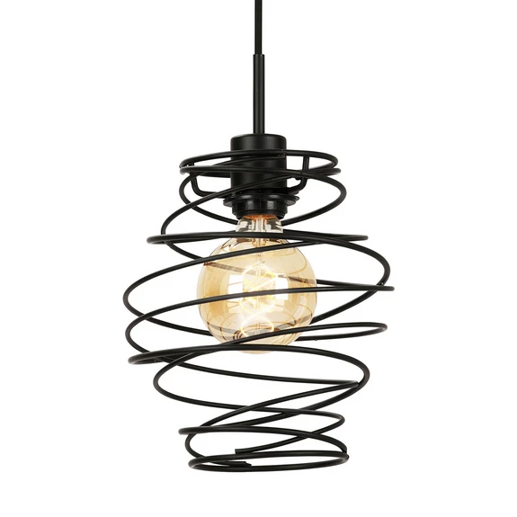 Suspension à 1 lampe Black Steel avec spirales métalliques décoratives La suspension Black Steel attire le regard dans les endroits les plus divers. La suspension à 1 lampe est équipée de spirales métalliques décoratives qui, partant de la douille, sont disposées en désordre vers le bas et entourent l'ampoule. On a presque l'impression que les spirales bougent au moindre souffle de vent. Le luminaire est particulièrement beau avec une ampoule globe aux nuances dorées. L'ampoule n'est pas fournie, mais peut être commandée en même temps.