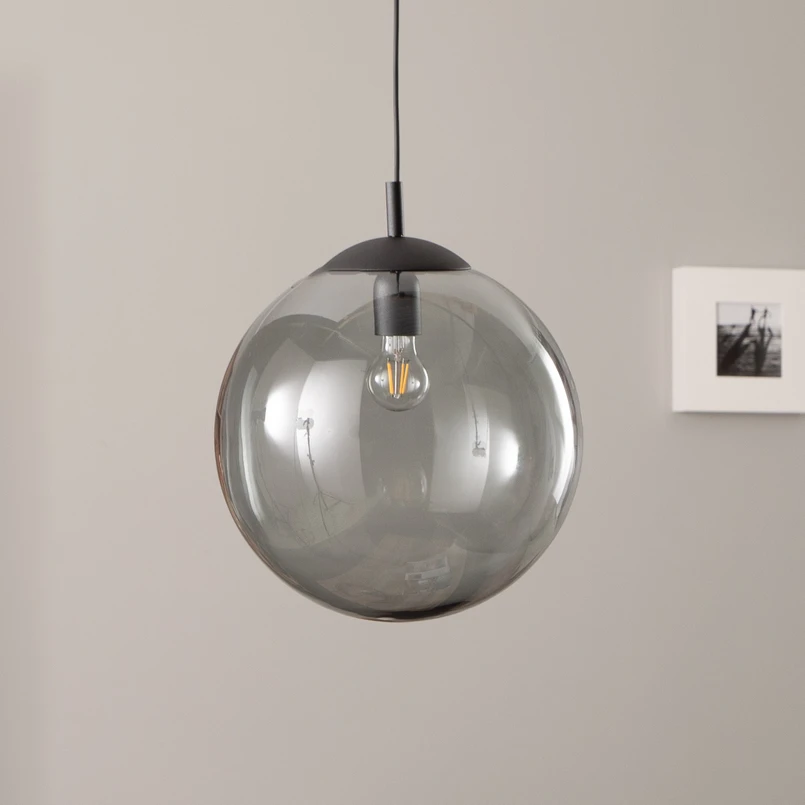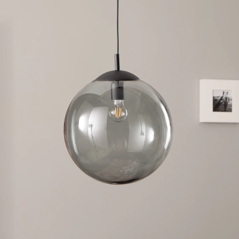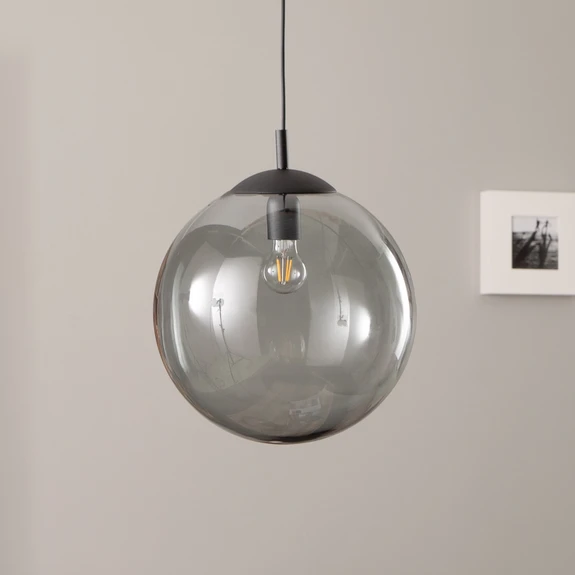 Suspension en verre Esme avec abat-jour sphérique gris graphite La suspension Esme plaît avec son abat-jour sphérique dont le verre est teinté en gris graphite et qui laisse entrevoir l'ampoule à utiliser. Le support, le câble et la rosace sont noirs.