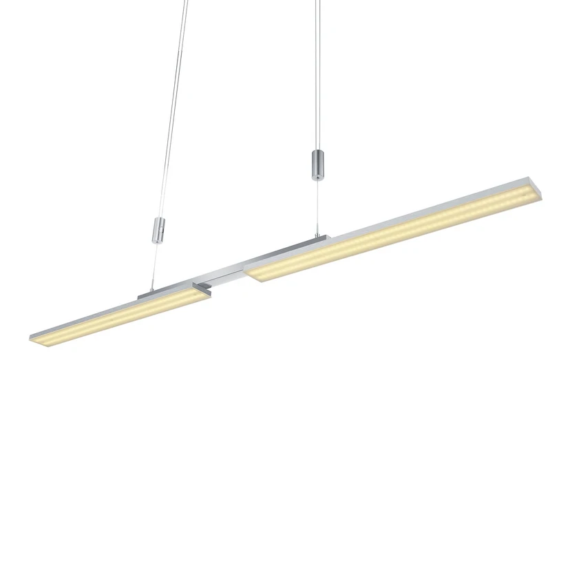 Suspension LED Less, réglable en hauteur et équipée de variateurs tactilesUn design anguleux et moderne caractérise la suspension LED Less, dont la suspension peut être réglée en quelques gestes. Les deux éléments lumineux latéraux diffusent un éclairage direct vers le bas pour éclairer directement une longue table, tandis que l'élément central, qui relie les deux éléments diffusant vers le bas, a été orienté de manière à diffuser vers le haut et offre un éclairage indirect de la pièce. Les deux sources lumineuses peuvent être allumées séparément. Un variateur à bouton-poussoir situé à gauche de l'élément d'éclairage supérieur permet d'allumer et de faire varier l'intensité de la lumière diffusée vers le bas, tandis que le bouton-poussoir monté à droite de l'élément d'éclairage supérieur permet de régler la lumière diffusée vers le haut.La suspension LED Less en nickel mat avec des détails chromés est la source de lumière idéale pour les longues tables de salle à manger ou pour le comptoir de la cuisine dans les appartements de conception moderne.