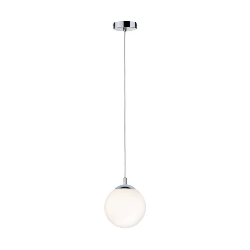 La suspension Globe de Paulmann allie un design moderne à des matériaux haut de gamme tels que le verre et le métal. La combinaison du verre satiné blanc et des accents chromés confère à la lampe une élégance intemporelle qui s'intègre harmonieusement à différents styles d'intérieur. Grâce à sa protection IP44, elle est idéale pour une utilisation dans des pièces humides telles que les salles de bains, tout en créant une ambiance élégante dans les salons, les salles à manger ou les cuisines.