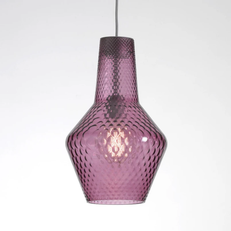 Lampe à suspendre Romeo avec abat-jour en verre couleur améthyste Avec la lampe à suspendre Romeo, on obtient non seulement une simple source de lumière, mais en même temps un élément de décoration à l'effet "wow". Le verre structuré en améthyste met parfaitement en scène les pièces d'habitation et assure de superbes conditions d'éclairage. Le designer Federico de Majo est connu pour ses variations de verre colorées.