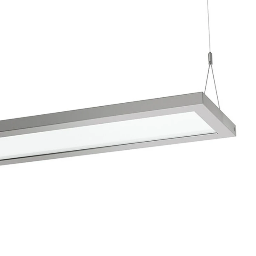 Suspension LED rectangulaire SL629PL - un éclairage de bureau efficace La fonctionnalité de cette suspension LED est au centre de son apparence simple, avec sa structure rectangulaire grise en aluminium moulé sous pression et en tôle d'acier, ainsi que son diffuseur plat blanc. Le SL629 est équipé de LED puissantes dont la lumière est émise en nappe vers le haut pour un éclairage indirect et directement sur la zone de travail située en dessous. Grâce à l'effet lumineux uniforme et sans éblouissement produit par un cache prismatique conforme à la norme EN 12464-1, son utilisation au-dessus des postes de travail sur écran est également appropriée - Tolérance de couleur MacAdam : ≤ 3 SDCM - Répartition homogène de la luminance sur toute la surface de sortie de la lumière grâce à la technologie LED sidelight - Durée de vie des LED : L80B10 - 50 000 h - Répartition lumineuse : directe et indirecte, symétrique, 41° / 52° - Résistance aux chocs : IK05