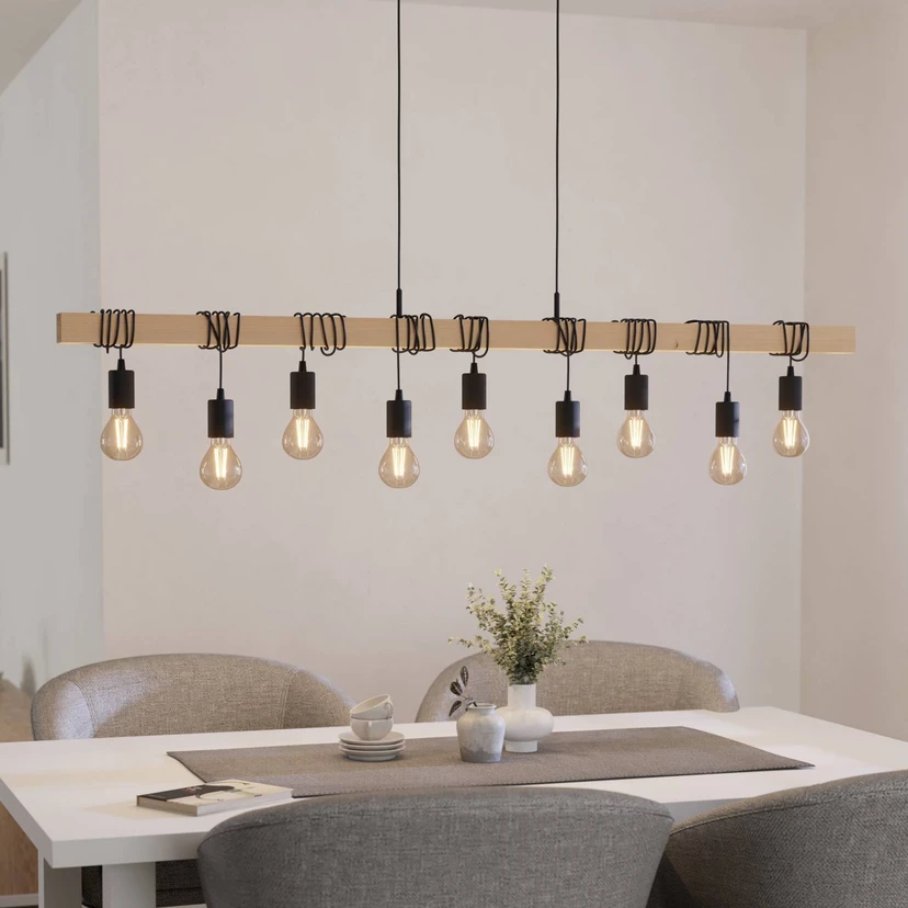 Suspension Townshend, longueur 150 cm, noir/bois, à 9 lampes.