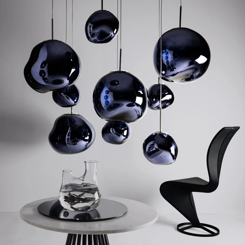 Suspension LED à 1 lampe Melt Mini - un point fort optique avec un effet lumineux frappant Melt Mini fait partie de la série de luminaires décoratifs Melt de Tom Dixon, qui comprend différentes suspensions ainsi que des appliques et des lampadaires et qui se distingue par son design extravagant donnant l'impression d'être en verre fondu. Cet effet a donné à la série de luminaires son nom de Melt ("fondu"). La fabrication de Melt fait appel à un procédé spécial : le dépôt de couches minces sous vide avec une surface semi-métallisée. Cet effet semi-réfléchissant est également connu pour les lunettes de soleil à la mode. Avec Melt Mini, l'abat-jour est translucide lorsque la lumière est allumée, et l'effet hyper-réfléchissant se produit lorsque la lumière est éteinte. - intensité variable externe