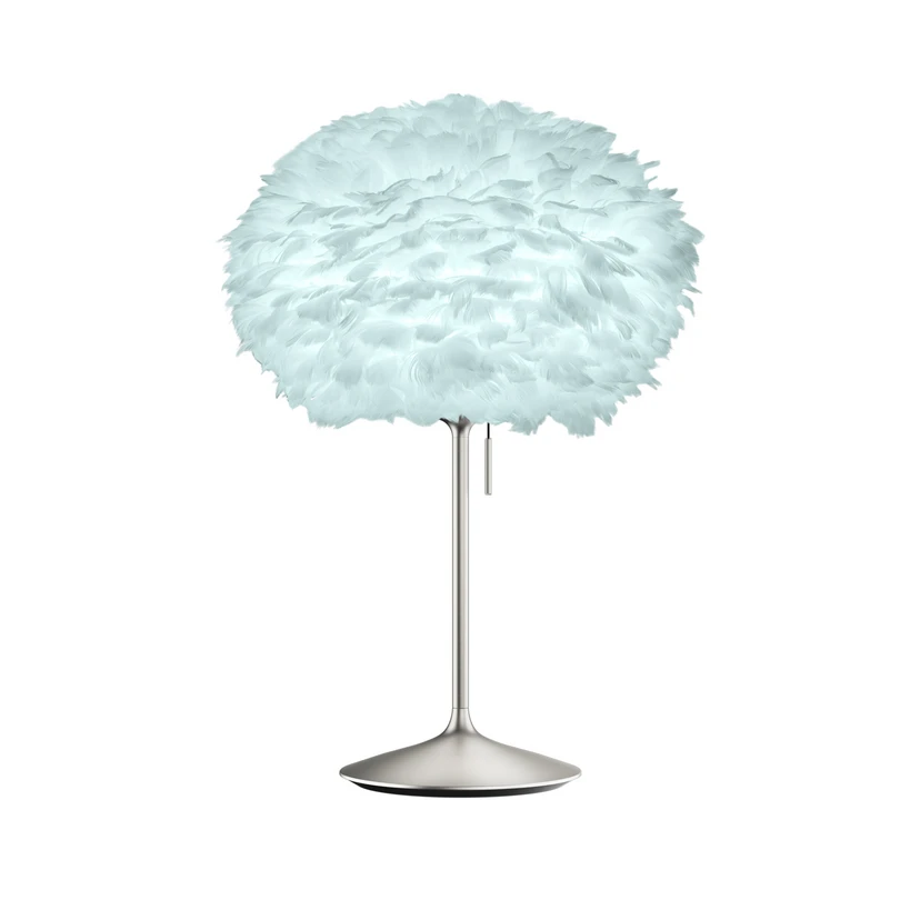 Lampe de table Eos medium avec un abat-jour en plumes sur une structure en acier