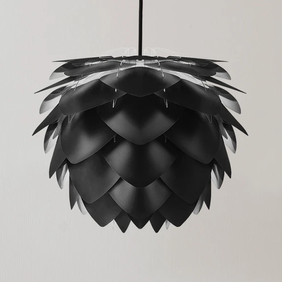 Grâce à la coloration noire continue de la lampe suspendue Silvia, la lampe se voit conférer un caractère très particulier. Le noir a un effet mystérieux, suscite la curiosité et laisse résonner un sentiment d'infini. Contrairement à la couleur blanche pure, ce luminaire noir n'est pas du tout morne. L'application passionnante des feuilles triangulaires d'aspect organique crée une structure enchanteresse qui permet à la lumière et à l'ombre d'être égales. La répartition de la lumière de l'intérieur sombre sur les différentes structures crée des moments captivants et enveloppe l'environnement dans une atmosphère apaisante. L'effet élégant et simple de la lampe suspendue Silvia, grâce à la disposition régulière des éléments qui forment l'abat-jour, incarne un certain ordre, ce qui permet de l'intégrer facilement dans les styles d'ameublement modernes. Silvia est un véritable accroche-regard lorsqu'elle est allumée et éteinte. La teinte noire est parfaitement complétée par le baldaquin noir du plafond et le câble textile.