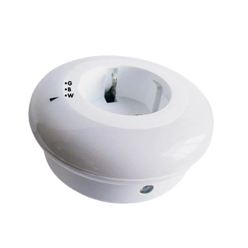 Veilleuse LED innovante GBW avec capteur et couleur de lumière changeanteLa veilleuse LED ronde GBW pour prise de courant est équipée d'un capteur crépusculaire, de sorte qu'elle s'allume automatiquement dans l'obscurité. En tournant la couronne de la lampe, il est possible de changer la couleur de la lumière, au choix : blanc, bleu et vert.