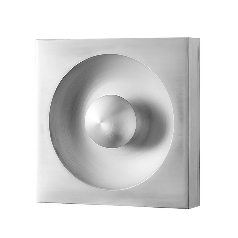 La grande lampe carrée présente un creux circulaire en son centre. La douille de l'ampoule y est également dissimulée au centre, derrière le petit abat-jour hémisphérique. La lumière émise s'y réfracte et l'éblouissement est évité.